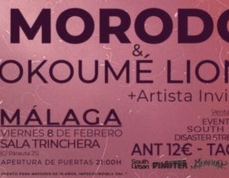 MORODO & OKOUMÉ LIONS EN MÁLAGA ARTISTA INVITADO El 8 de febrero vente a la SALA TRINCHERA para una noche de reggae al más puro estilo de Morodo con la mejor banda de reggae! Sala Trinchera: Calle Parauta, 25. Apertura de puertas 21:00h. Entrada anticipada 12€ Entrada en taquilla 15€ Evento para mayores de 16 años.