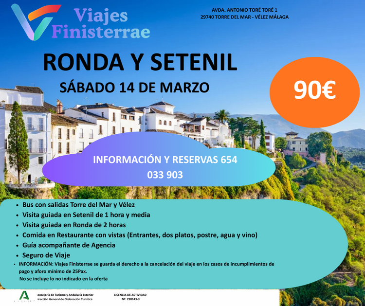 Para que todo el mundo pueda disfrutarlo, Ven sol@ o acompañad@, viajaremos en grupo, trayecto ida y vuelta en autobús con recogidas en los puntos señalados, disfrutaremos de visita guiada en cada uno de los destinos con un guía oficial, almuerzo en restaurante con vistas privilegiadas a la serranía de Ronda, guía acompañante de agencia y seguro de viaje incluido.