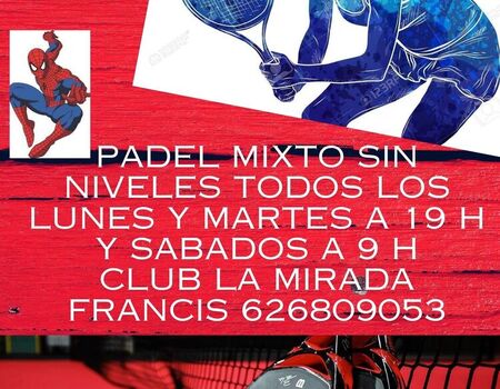 PPadel pull mixtas sin niveles todos los lunes martes a y sabados a 9 H organiza padell malaga en club la mirada junto al parque tecnologico para participar debes de llamar al tlf 626809053 francis 6 pistas de cristal con bolas incluidas.